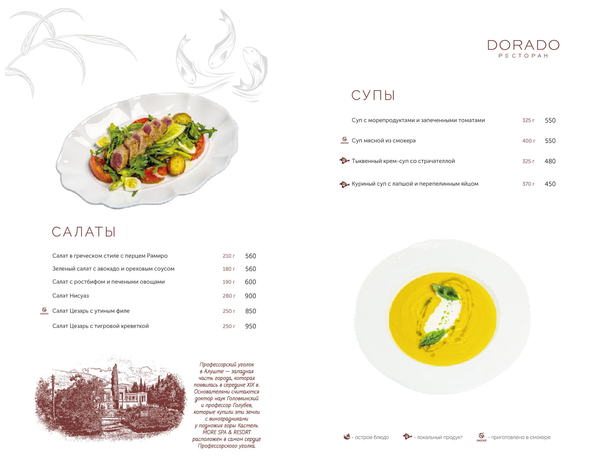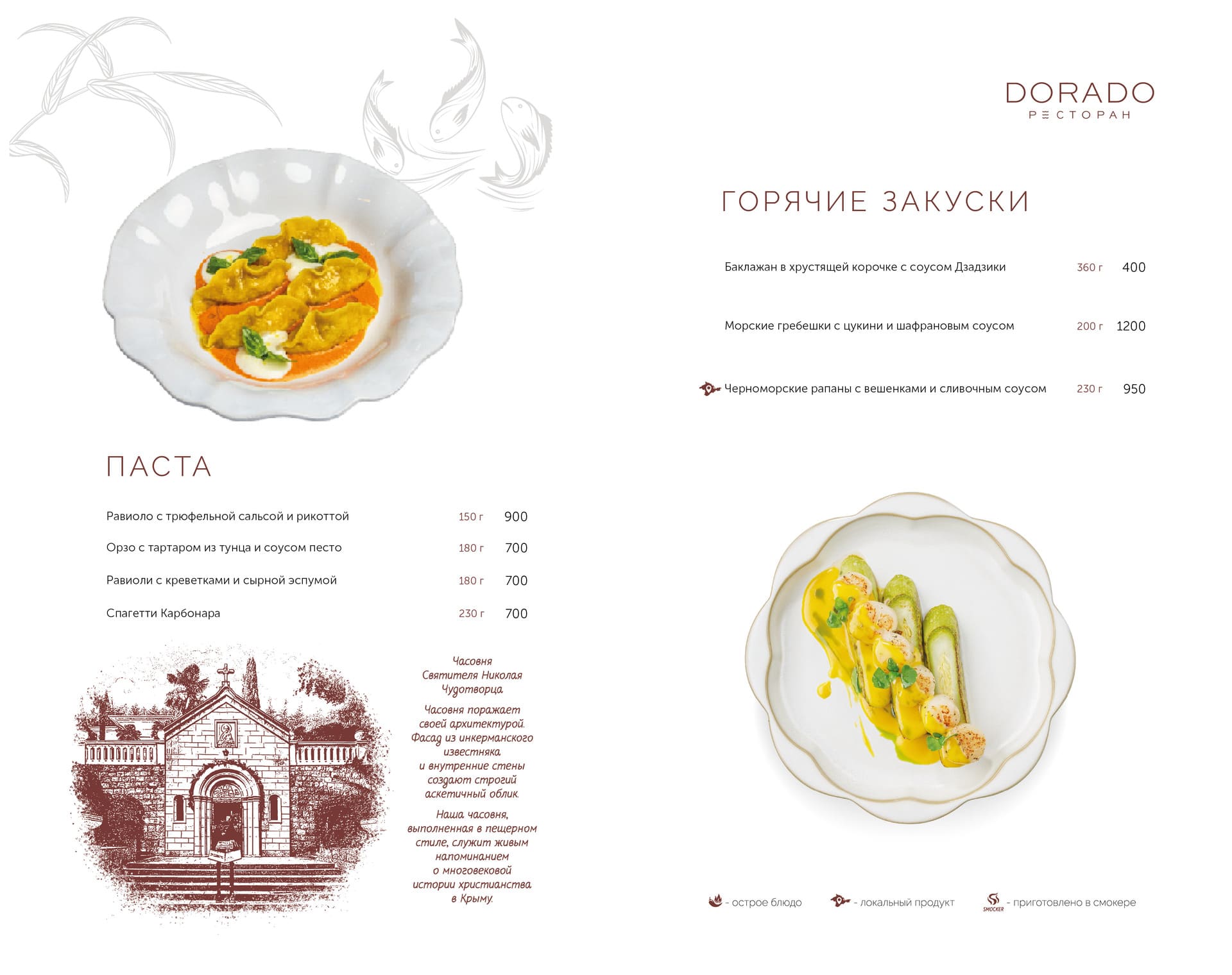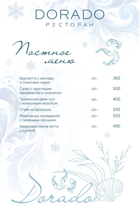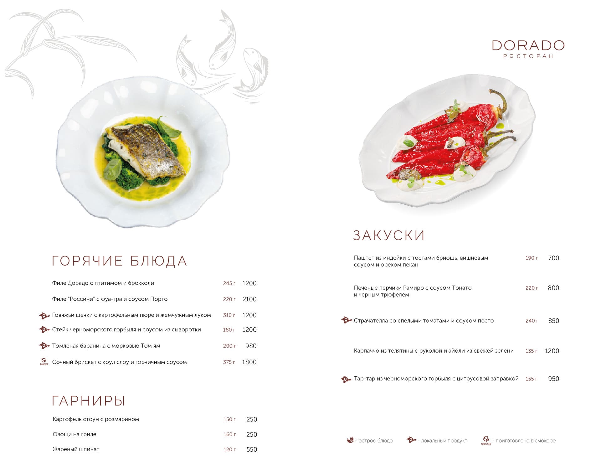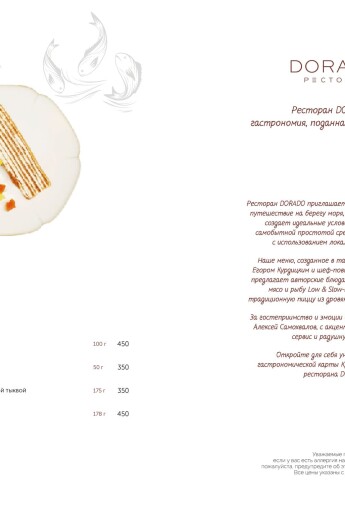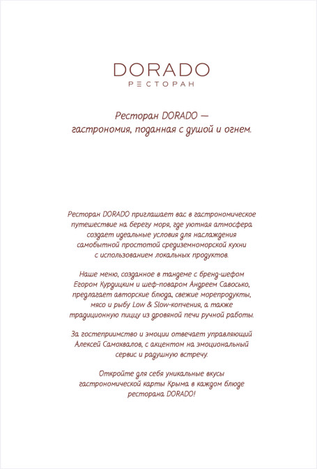 Актуальное меню ресторана ДОРАДО в Алуште, Крым: уникальные сочетания, локальные продукты, эксклюзивные позиции. Гастрономия, поданная с душой и огнём.