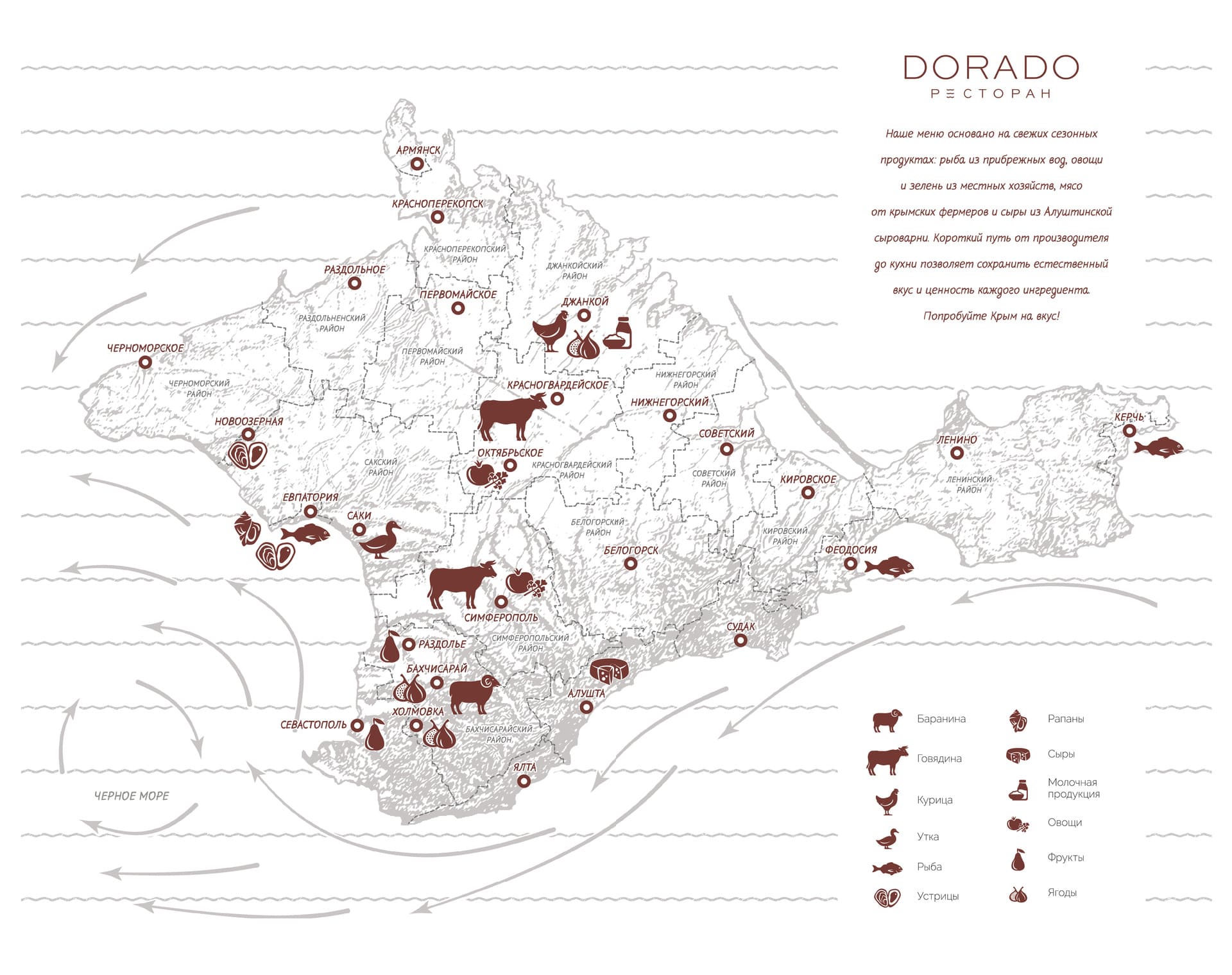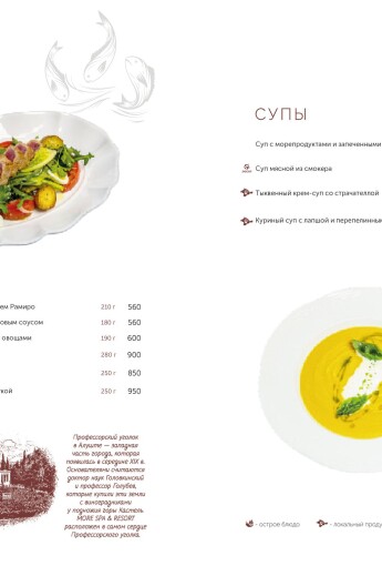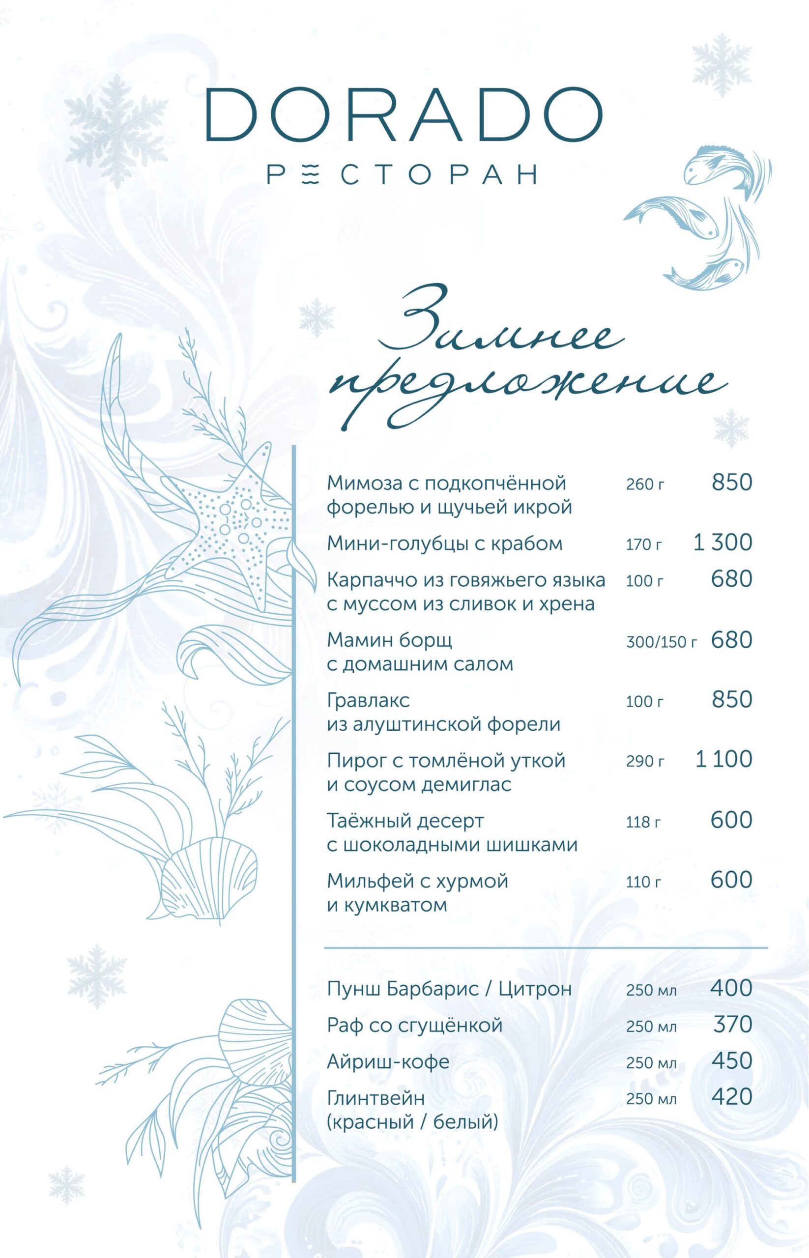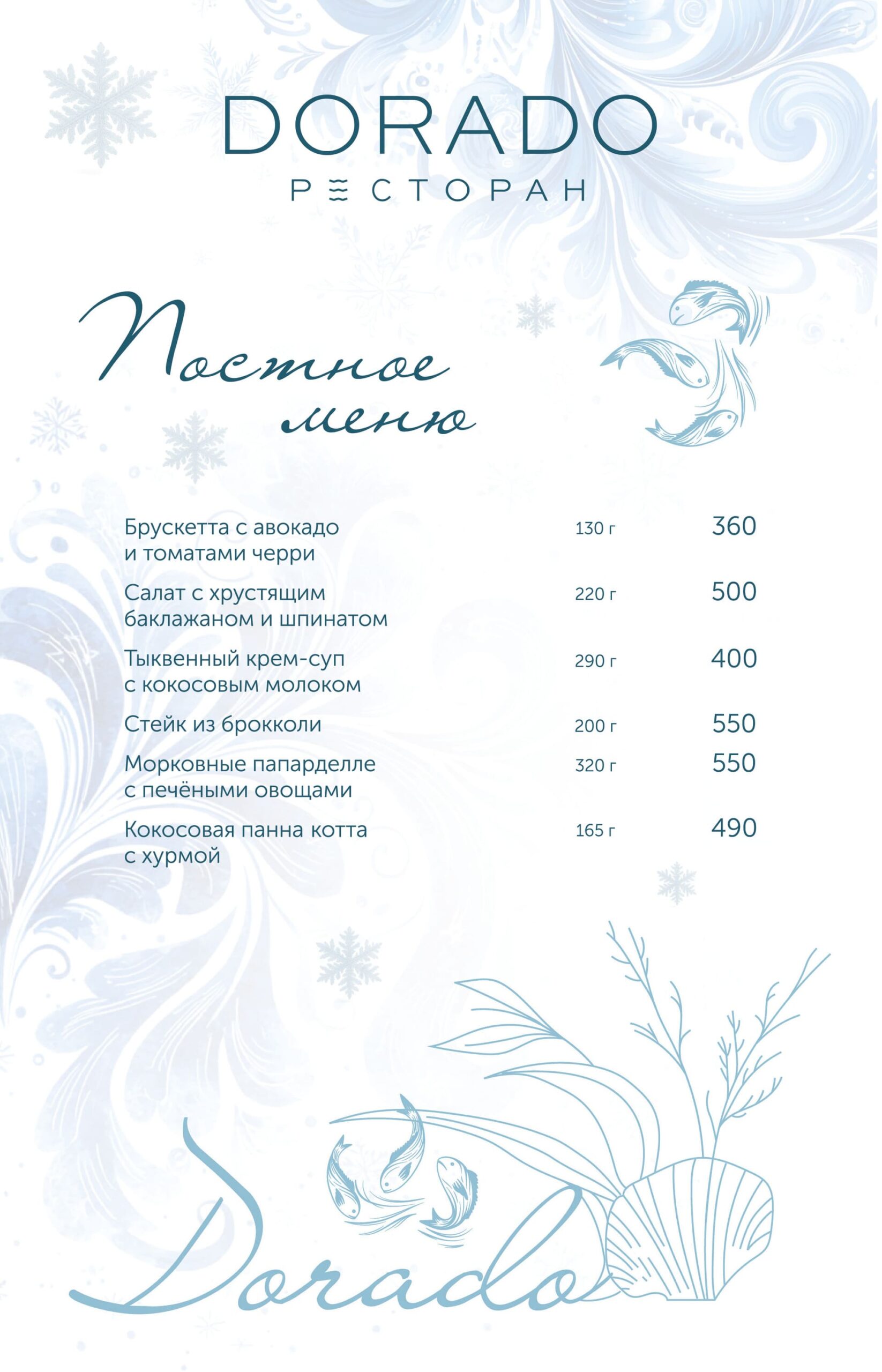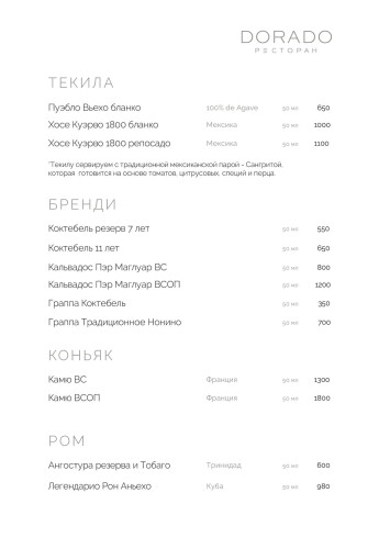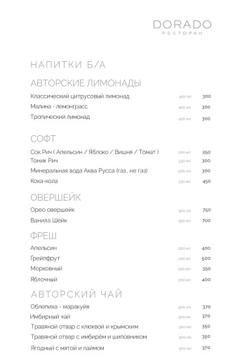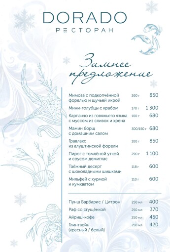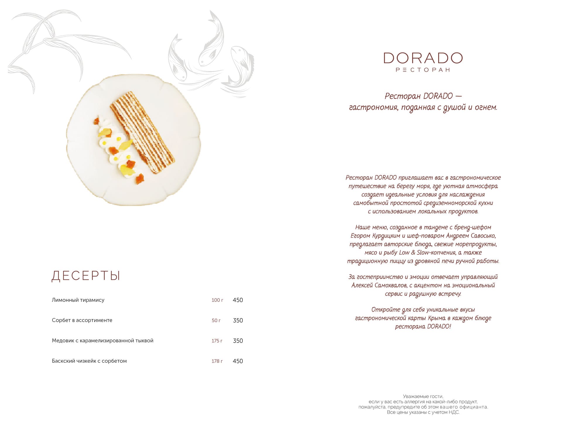 Актуальное меню ресторана ДОРАДО в Алуште, Крым: уникальные сочетания, локальные продукты, эксклюзивные позиции. Гастрономия, поданная с душой и огнём.